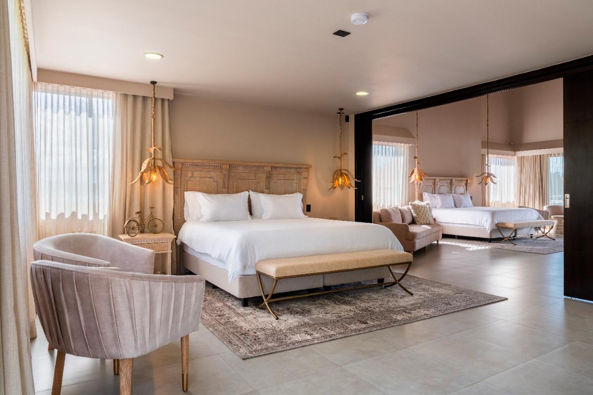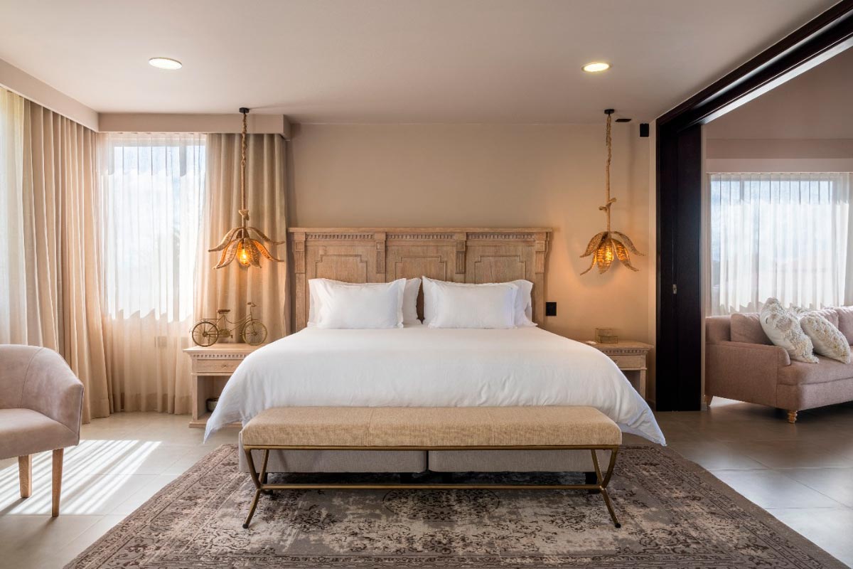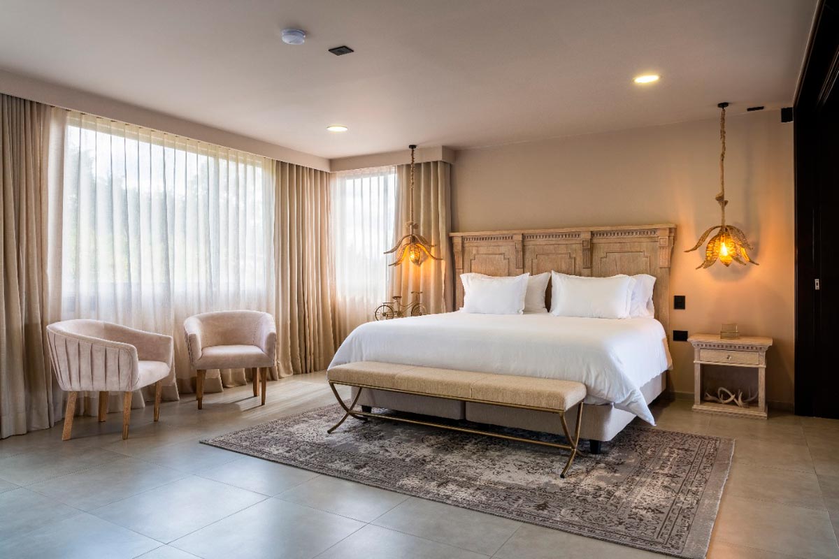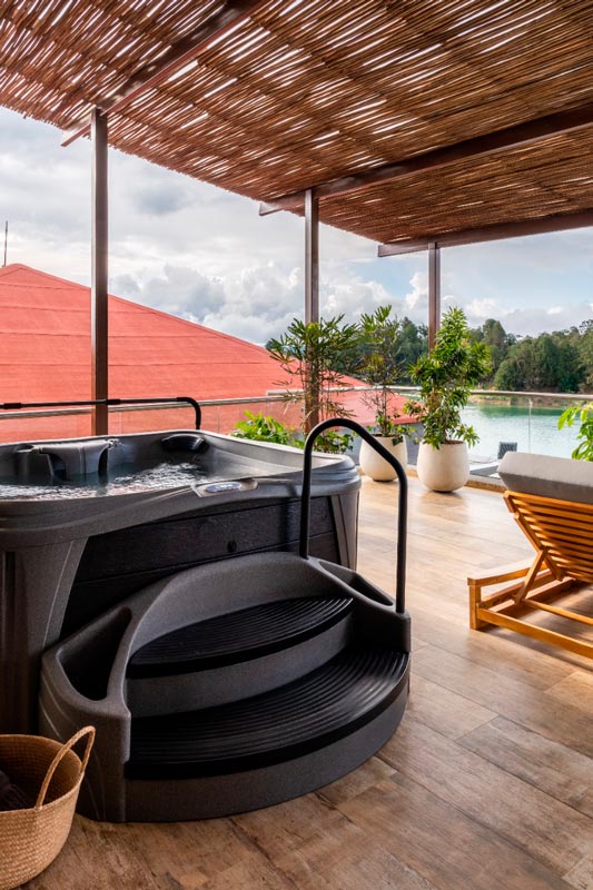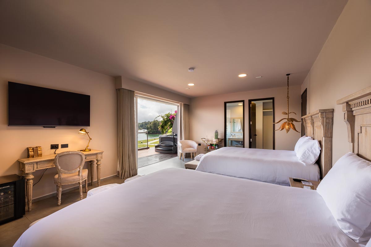 200 metros cuadrados, diseñada para ser completamente accesible y cómoda para ti. Esta habitación incluye dos amplias camas tipo King, dos baños independientes, un espacioso balcón con impresionante vista al embalse, jacuzzi, vestidor y una acogedora sala de estar.